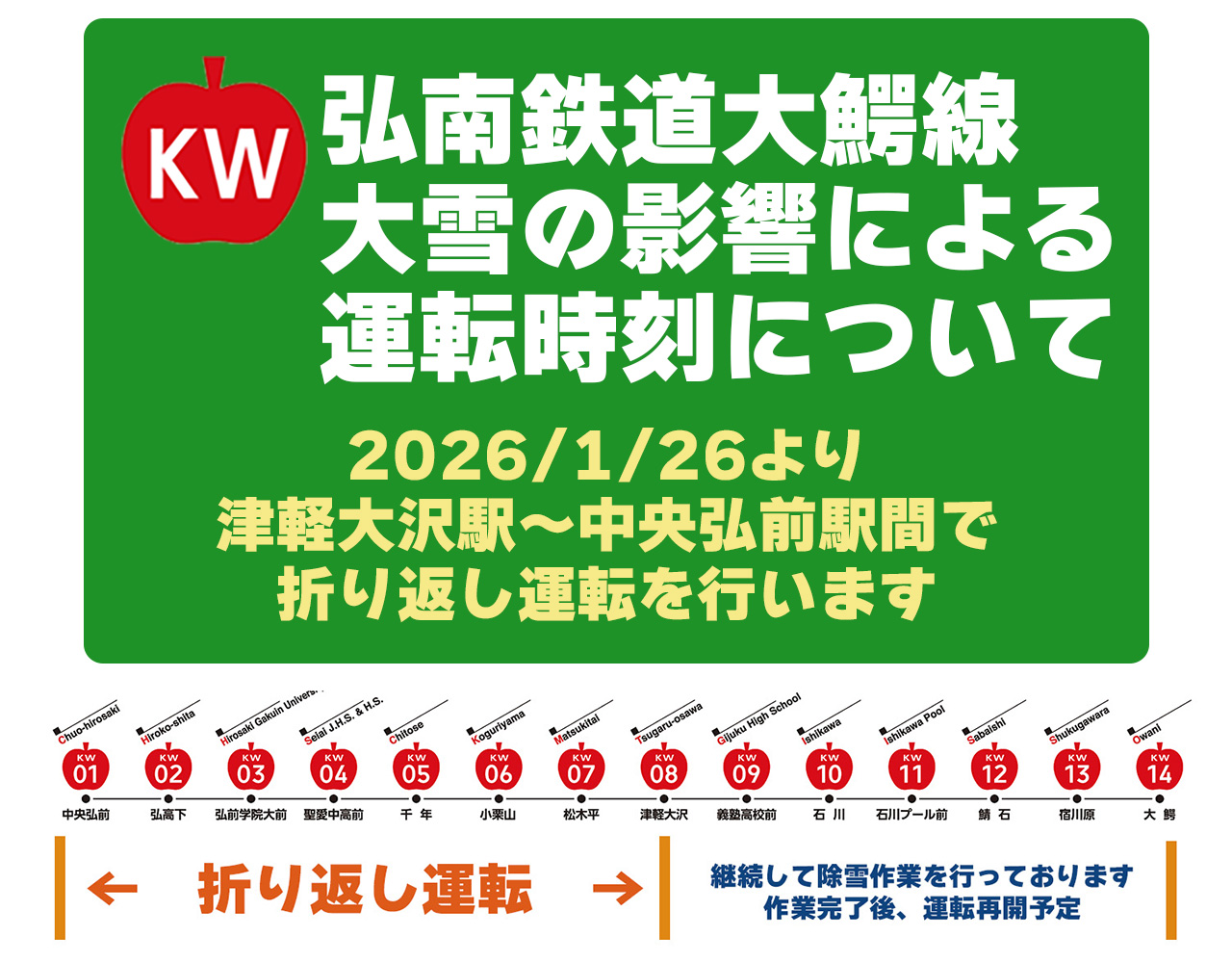 ★弘南鉄道大鰐線では、2026年1月26日(月)から津軽大沢駅~中央弘前駅間で折り返し運転となります 。詳細は下記をクリックしてご参照ください