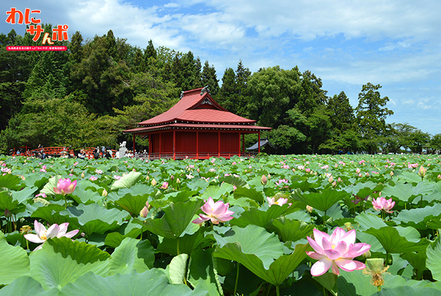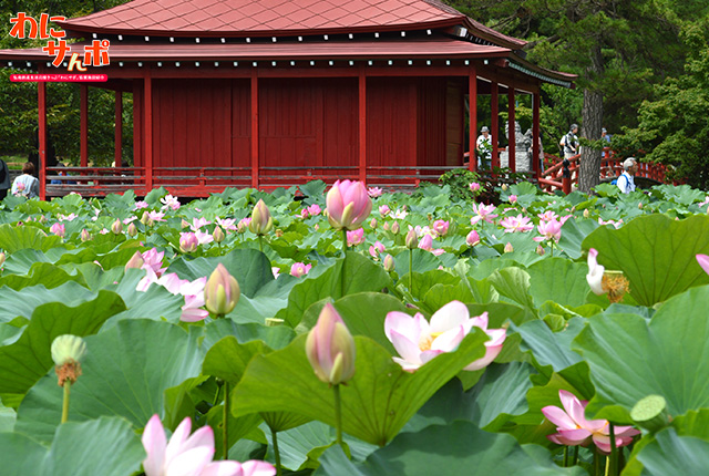 猿賀神社境内にある鏡ヶ池では、7月中旬からから9月初旬ごろまで、一面に咲く淡いピンク色の蓮の花を楽しむことができます。