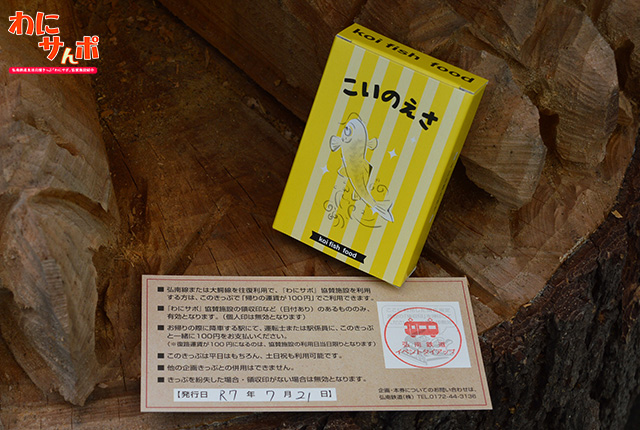 帰りの弘南線の運賃が100円だけでなく、猿賀公園の鯉の餌をプレゼントあり!のわにサポ特典あります!
