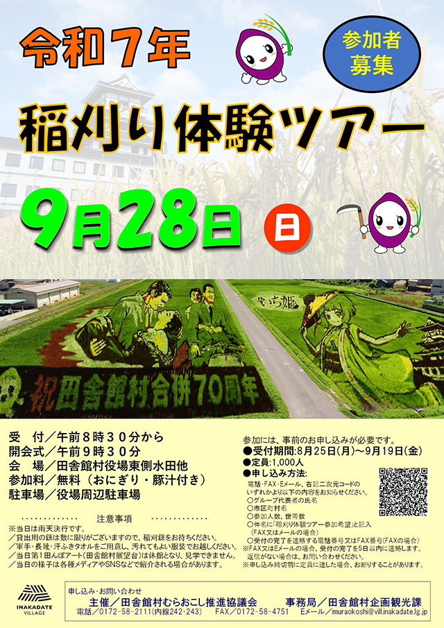 「田舎館村田んぼアート 稲刈り体験ツアー」が開催されます