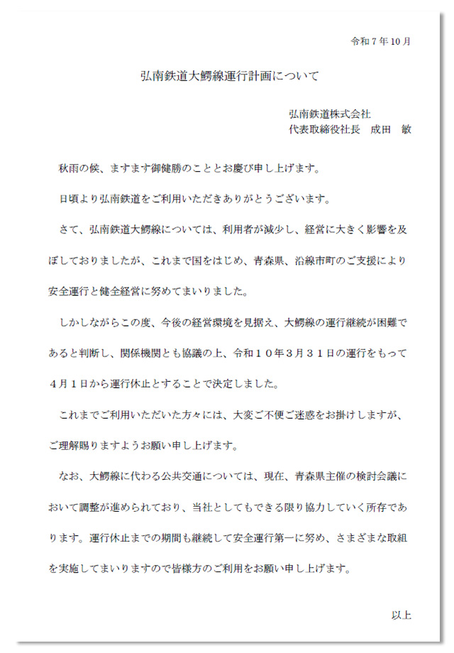 しかしながらこの度、今後の経営環境を見据え、大鰐線の運行継続が困難であると判断し、関係機関とも協議の上、令和10年(2028年)3月31日の運行をもって4月1日から運行休止とすることで決定しました。