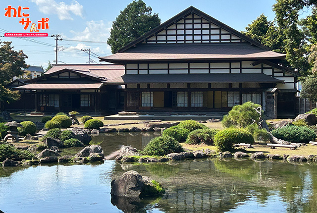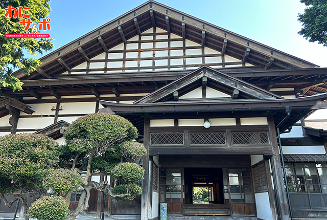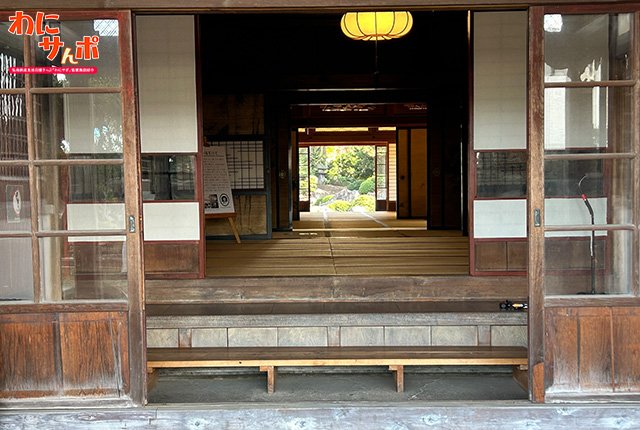 受付を入り、目の前に建つ旧加藤家住宅は、主屋・離れ・茶屋室で構成され、住宅内部には、弘前出身の日本画家:野沢如洋が描いた襖絵や、壁・襖前面に金箔が貼られた「金の間」京仏壇などが残されています。