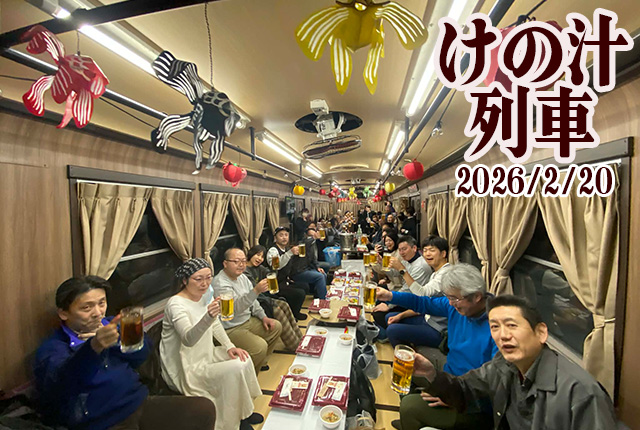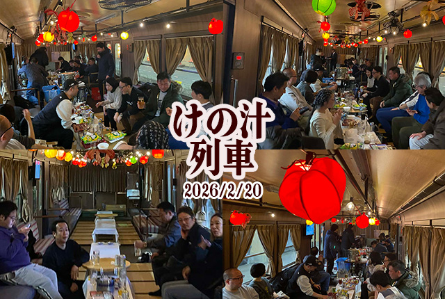 | 申込み方法 | 下記ボタンをクリックし、(株)日本旅行サイトにて申込みください 2026けの汁列車 申込はこちら ・・・日本旅行申込サイト(別ウインドウが開きます) ※申込締切:実施日の前日より起算して7日前まで。 ※申し込みは、上記WEBサイトからのみとなります。 ※定員数に達し次第、募集を締め切ります |
