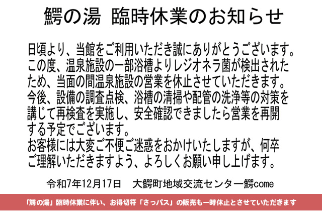 ・・・「鰐の湯」臨時休業のお知らせ(鰐comeホームページ)