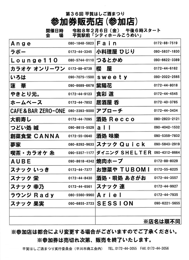 | 開催日 | 2026年2月6日(金) ※参加券(4000円)は、まつり参加店(下記参照)にて発売中 |