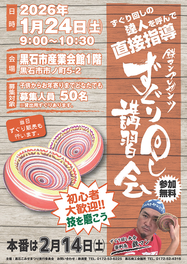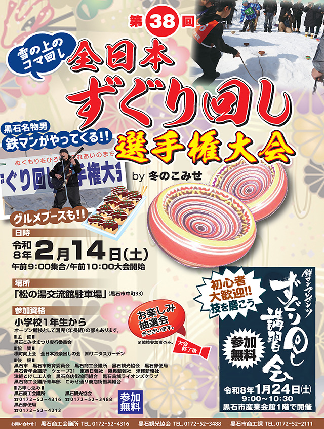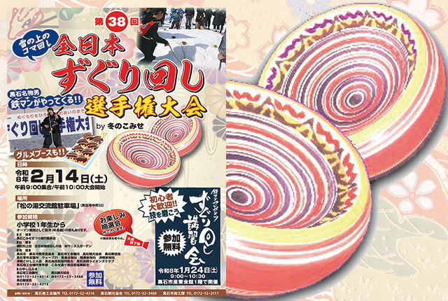 ・・・第38回 「全日本ずぐり回し選手権大会」及び「ずぐり回し講習会」開催のお知らせ(黒石観光協会ホームページ)(別ウインドウが開きます)