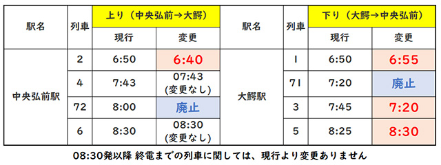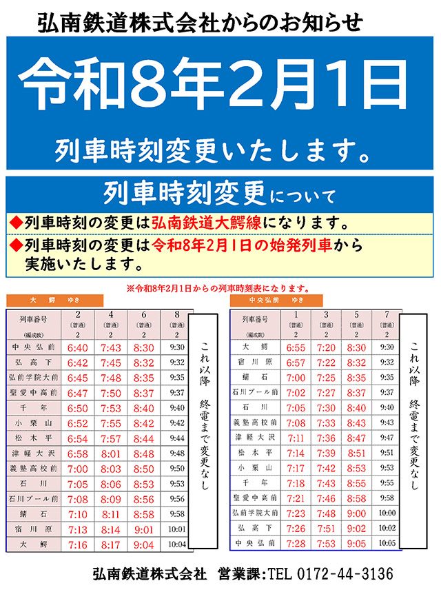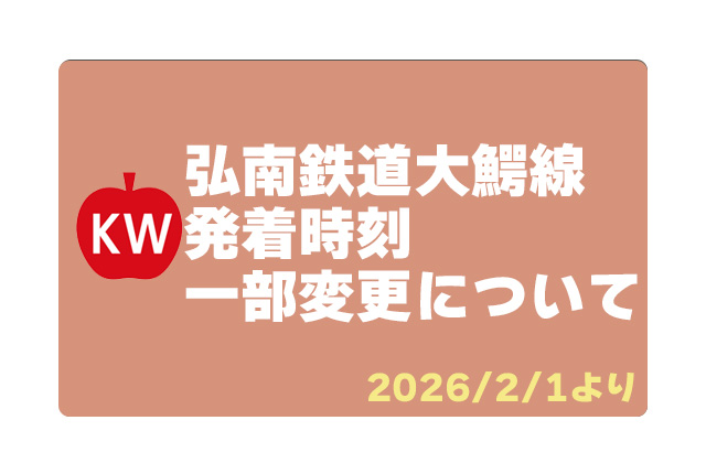 弊社においては、大鰐線車両の運用制限と運転士不足により、始発列車から午前8時台までの大鰐線旅客列車の発着時刻を、下記新時刻表のとおり変更のうえ、令和8(2026)年2月1日から実施しますので宜しくお願い致します。