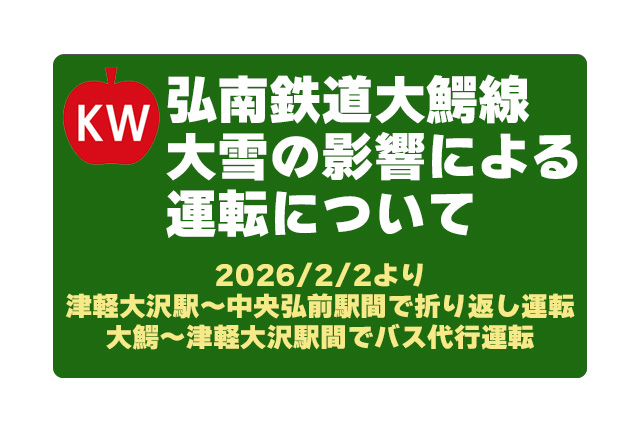 弘南鉄道大鰐線では、大雪の影響により、2026年2月2日(月)より津軽大沢駅~中央弘前駅間で折り返し運転・大鰐駅~津軽大沢駅間でバス代行を実施することといたしましたのでお知らせいたします