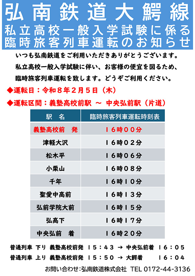 受験生の利便を図るため、下記のとおり弘南鉄道大鰐線にて、臨時旅客列車を運転致します