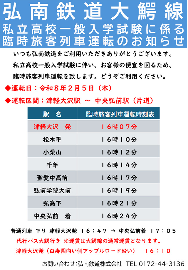 津軽大沢発 16:07 → 中央弘前着 16:24 ※臨時列車