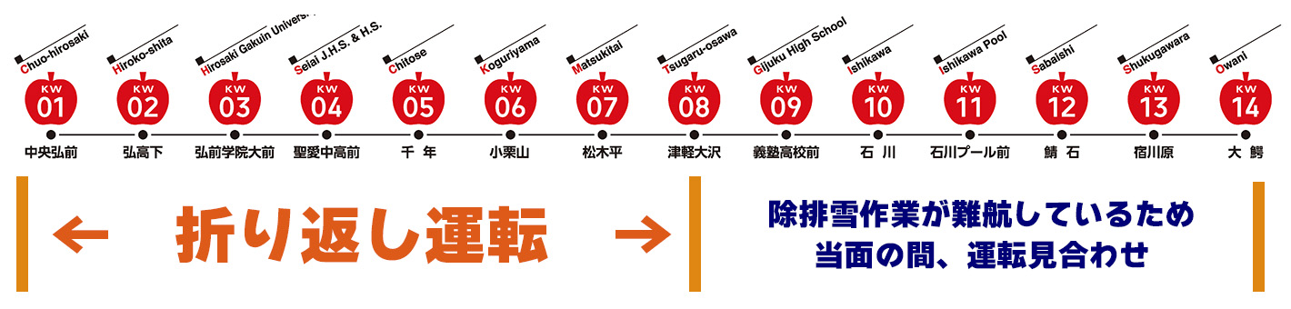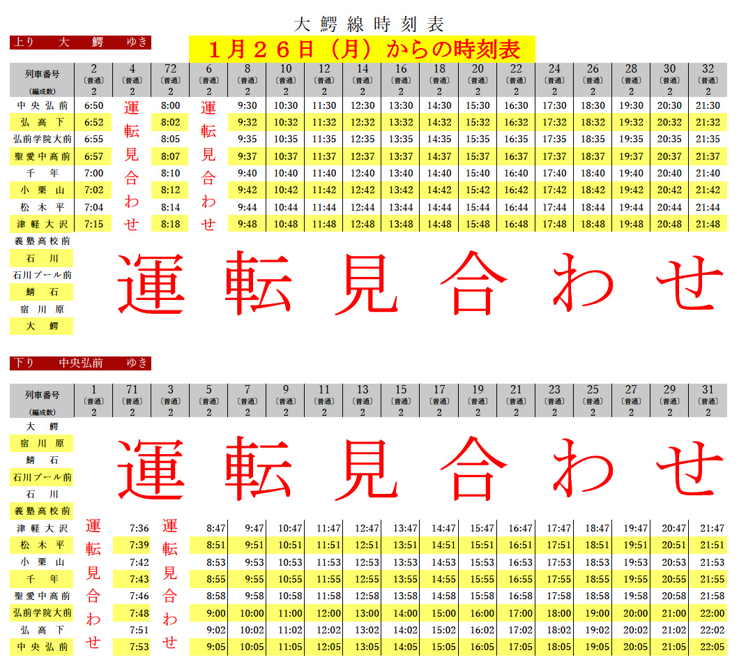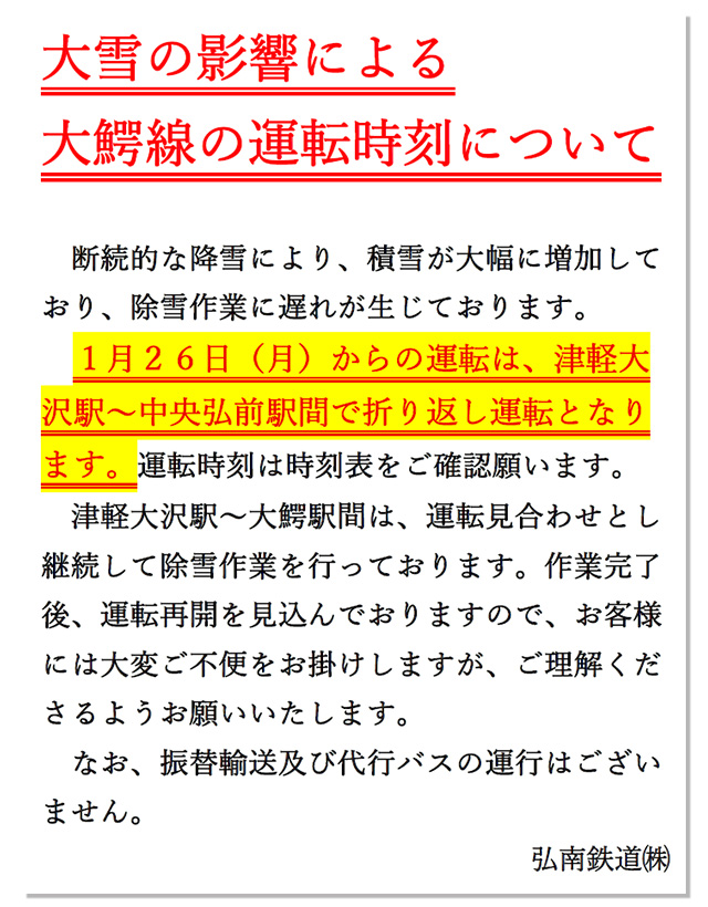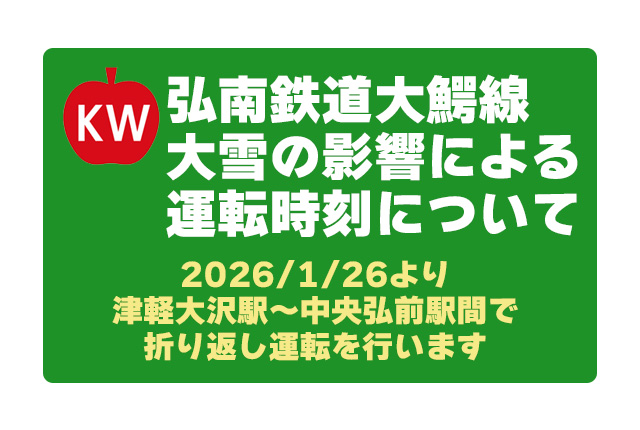 2026年1月26日(月)からの運転は、津軽大沢駅~中央弘前駅間で折り返し運転となります。