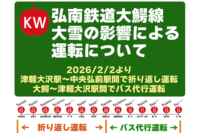 ★弘南鉄道大鰐線では、大雪の影響により、2026年2月2日(月)より津軽大沢駅~中央弘前駅間で折り返し運転・大鰐駅~津軽大沢駅間でバス代行を実施致します。