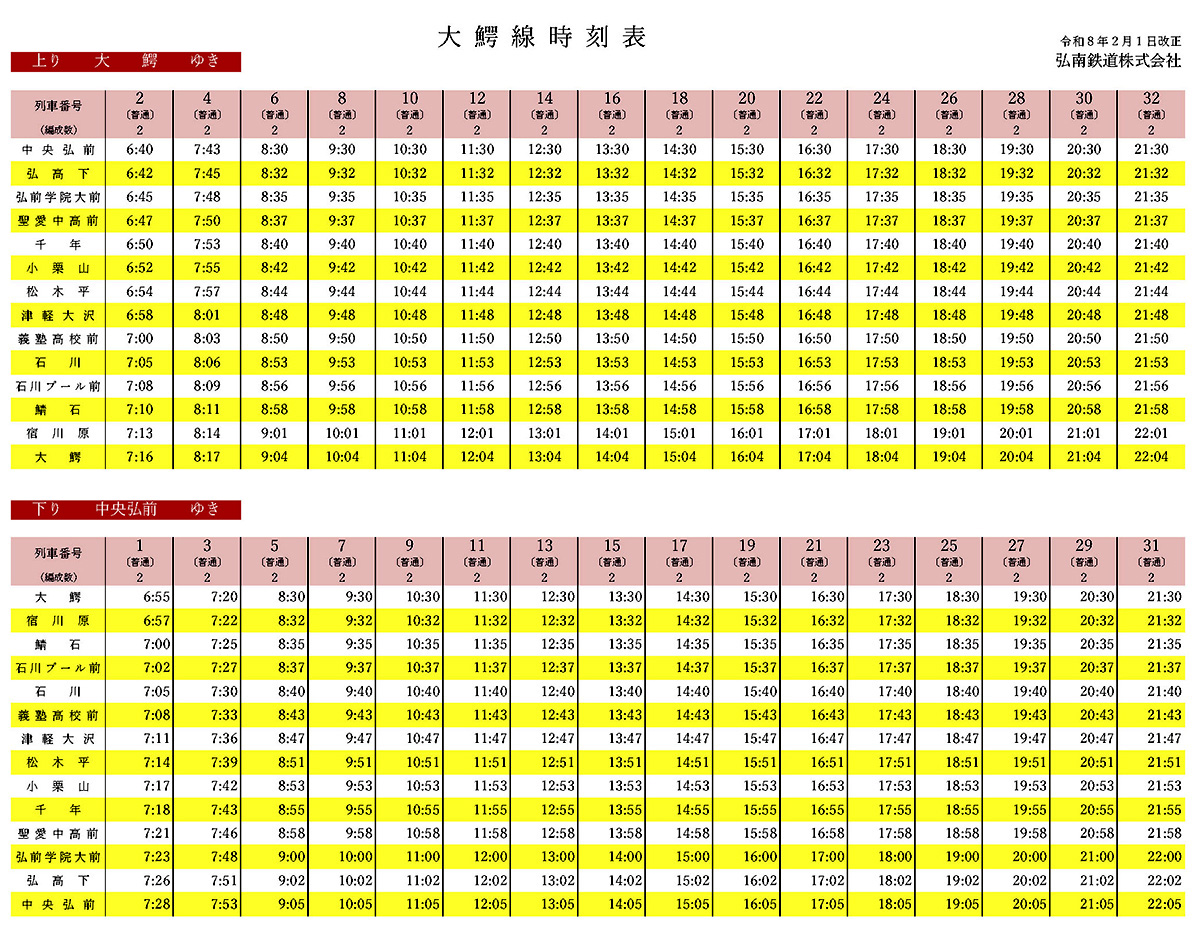 大鰐 – 宿川原 – 鯖石 – 石川プール前 – 石川 – 義塾高校前 – 津軽大沢 – 松木平 – 小栗山 – 千年 – 聖愛中高前 – 弘前学院大前 – 弘高下 – 中央弘前